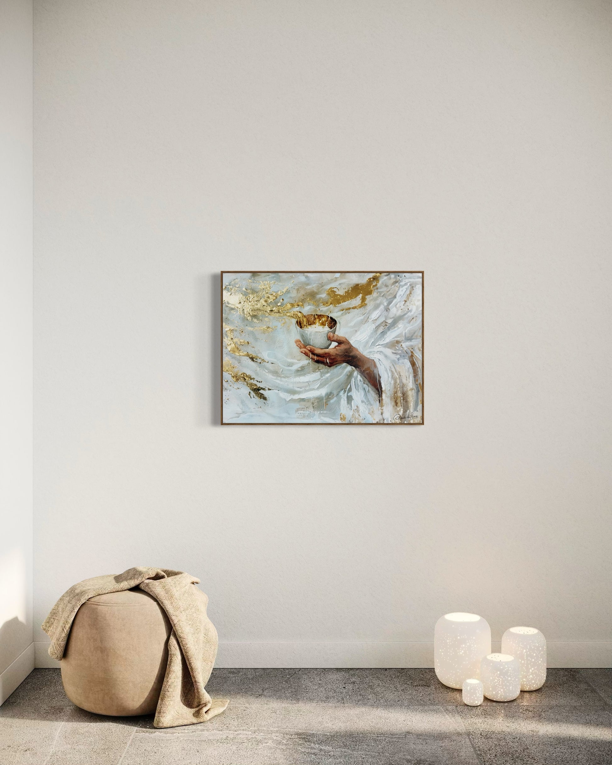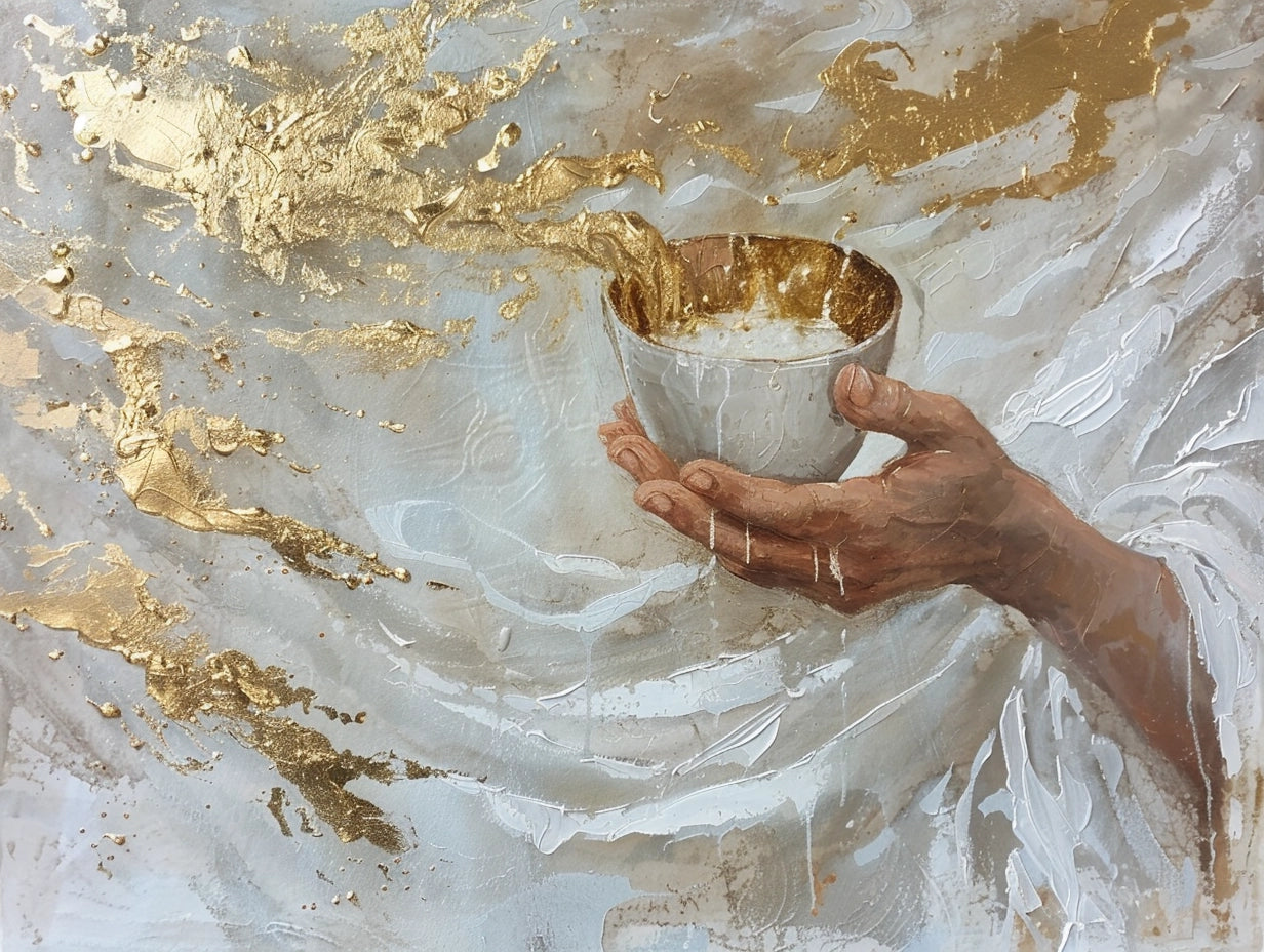 An Artwork of ethereal beauty and peace. In Jesus' hands rests a golden cup overflowing with water, symbolising the boundless compassion and grace found in the biblical narrative. The cup echoes the symbolism from the Last Supper, where Jesus offered wine as a representation of his sacrificial love and the new covenant with humanity. Here, the water pouring forth represents the life-giving spirit and renewal, drawing from passages like John 4:14, where Jesus speaks of giving "living water" that brings eternal life.