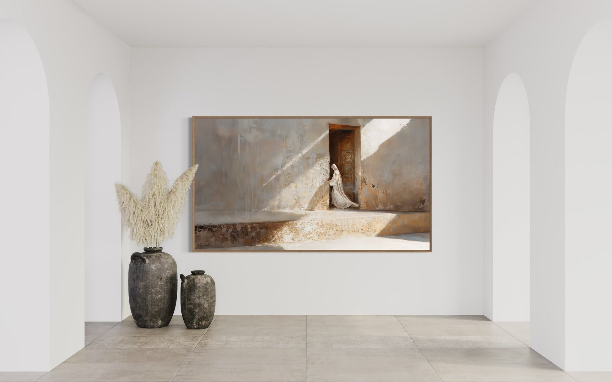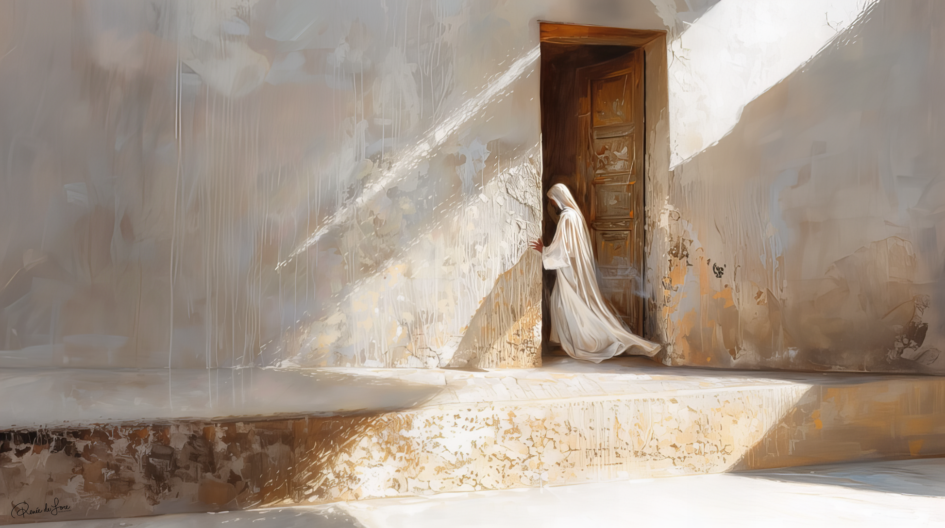 "Doorway to Salvation," depicts Jesus as the ultimate portal to redemption, drawing inspiration from the rich symbolism found throughout the Bible. In John 10:9, Jesus declares, "I am the door; if anyone enters through Me, he will be saved." This powerful imagery serves as the cornerstone of our collection "Threshold of Grace", inviting viewers to contemplate the profound significance of Christ as the gateway to eternal life.